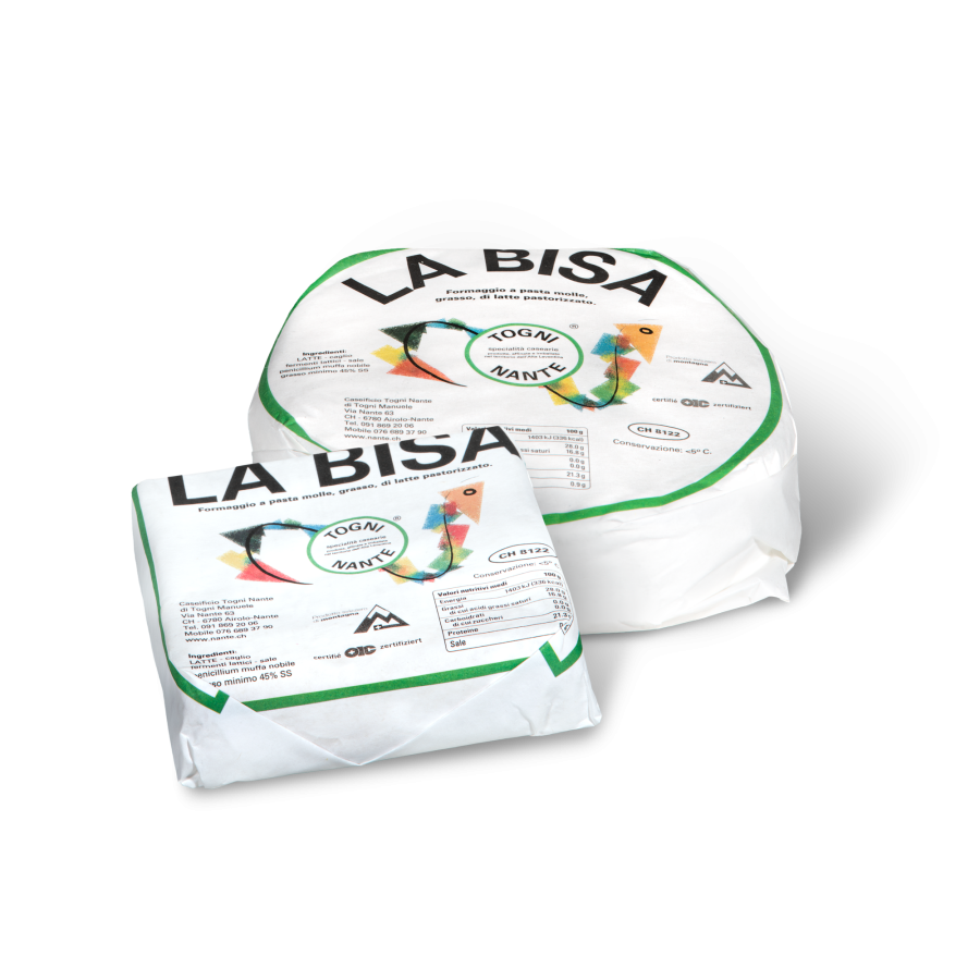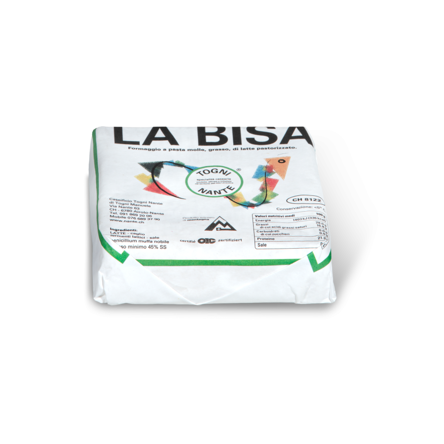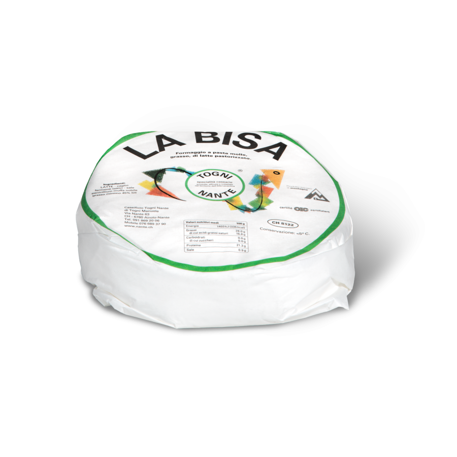 La Bisa è una specialita artigianale del Caseificio Togni Nante, prodotta con latte di montagna dell’Alta Leventina. Delicata e invitante, si distingue per la sua pasta semidura – molle, il gusto leggero e amabile e la crosta bianca, morbida e vellutata, frutto di una maturazione in ambiente controllato. Disponibile in due formati, La Bisa Rotonda da 490 g e La Bisa Quadrata da 200 g, si adatta perfettamente a diverse occasioni di consumo: dal piacere quotidiano a un tagliere raffinato, fino a un piccolo regalo genuino e apprezzato.